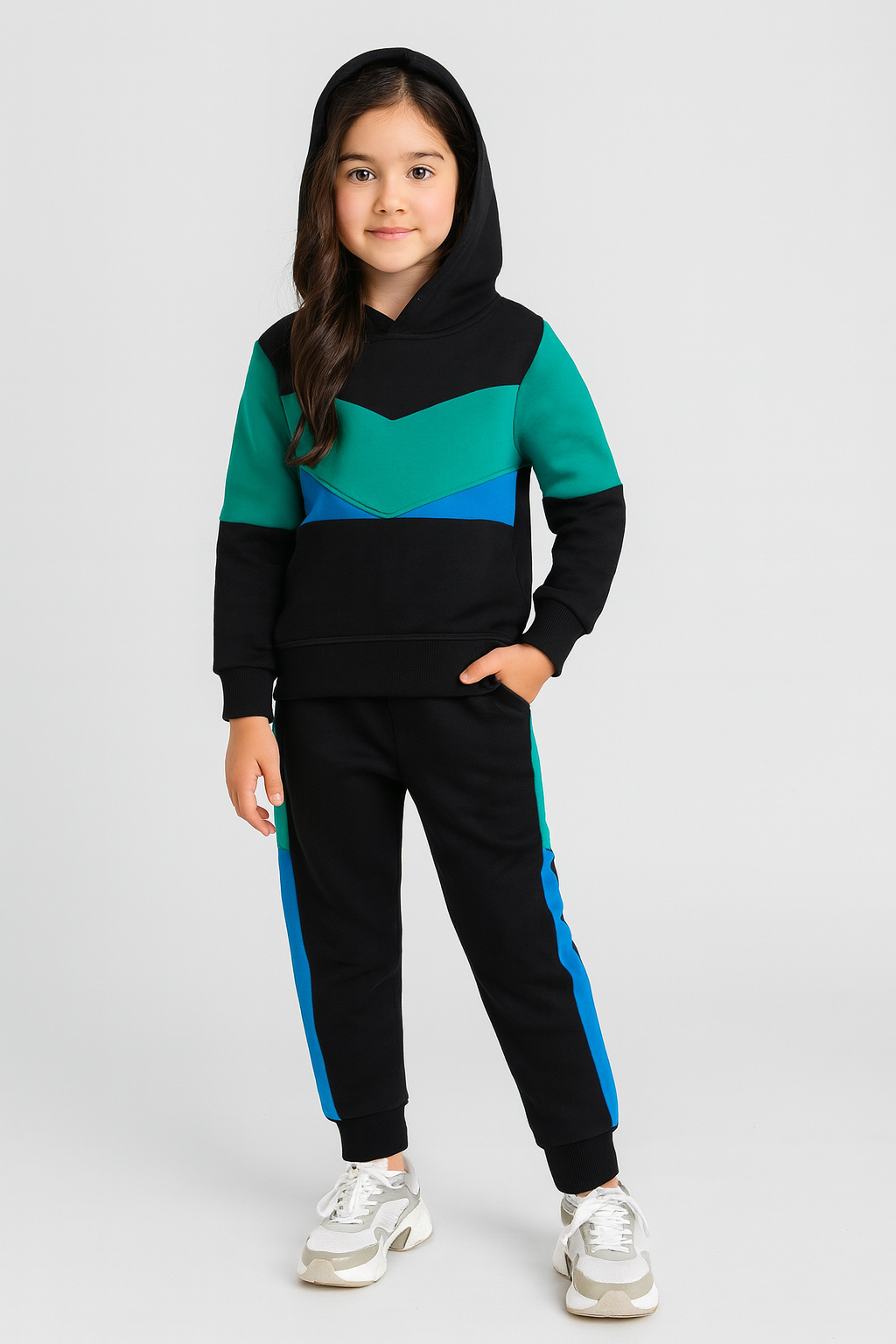 Colors: multi trouser with a sleek shine effect, paired with a vibrant Multi colors Hoodie.